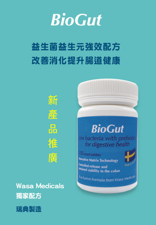 BioGut,由ProBion ABCD益生菌公司 Wasa Medicals 研製, 精選菌種配搭益生元,以低壓縮力製成乾爽片劑,確保益菌 長久存活並順利達至大腸發...