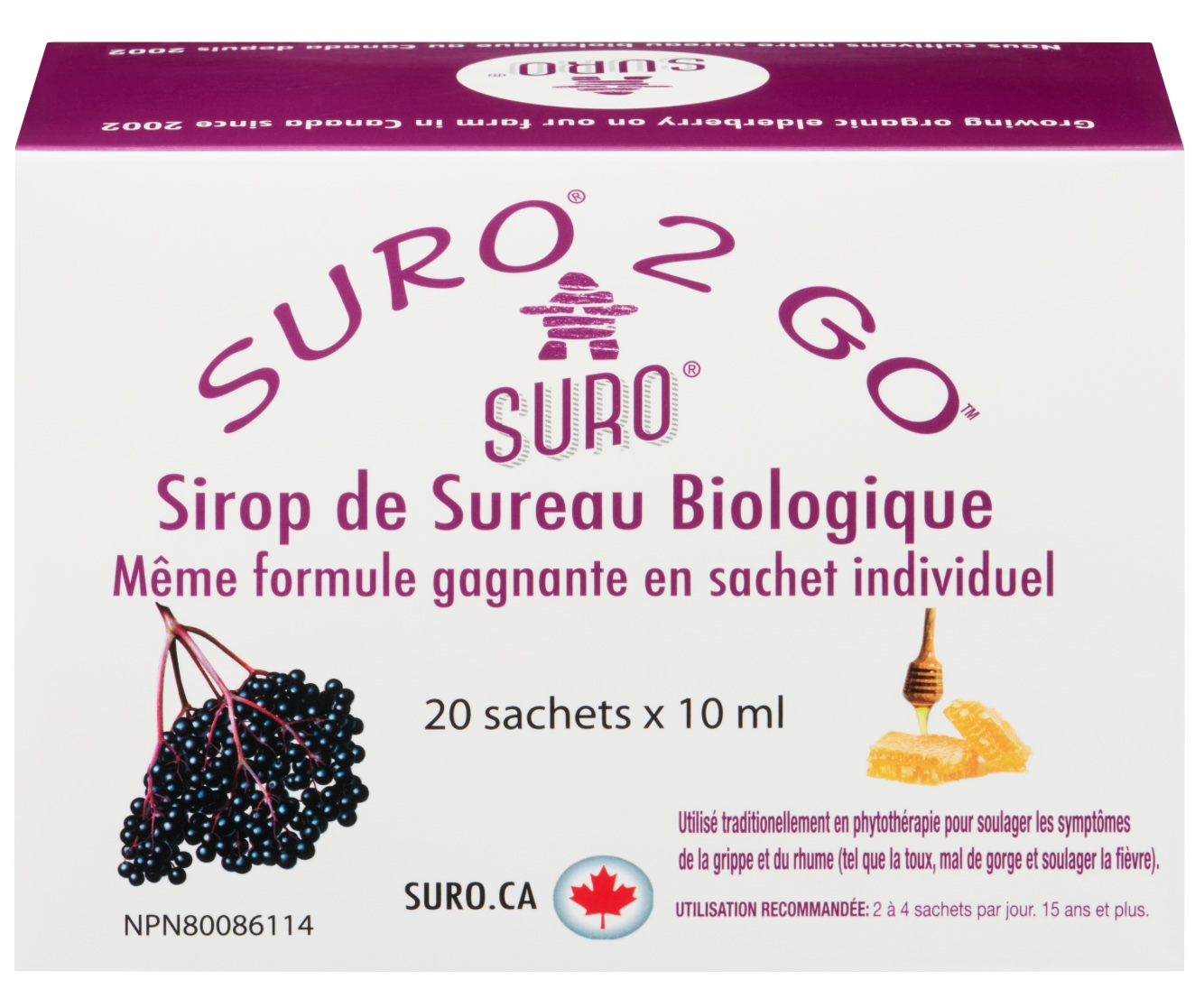 SURO 2 GO is made with elderberries and elderflowers organically grown in Southern Quebec of Canada, helps relieve cold and flu symptoms. Additional organic echinacea strengthens the body for combating infection and inflammation.
